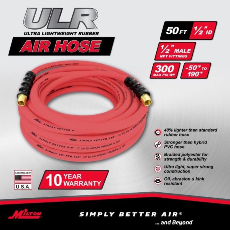 Built to withstand every extreme, theMilton 1/2″ Ultra Lightweight Rubber Air Hose offers the durability of typical rubber hoses while maintaining the ultra-lightweight convenience of a hybrid hose. The oil-resistant core tube and cover resist abrasion and strain and will not break down over time, while the brass National Pipe Fitting 1/2″ thread ends are built with bend restrictor ergonomic handle grips for leak-resistant performance. Forty percent more lightweight than traditional rubber hoses, this lightweight hose connector offers the flexibility of functioning in extreme conditions. The strong rubber material allows for optimal performance in temperatures ranging from -50F to 190F, with a Maximum Operating Pressure of 1,200 PSI and a Max Working Pressure of 300 PSI. The flexibility and strong ozone resistance ensure that the hose will not kink or leak, making it easy to carry, lift, and maneuver in the field. The hose can be easily rolled up, transported between work environments, and used in extreme weather. A 10-year extended warranty protects against repair costs. With a 50 foot reach, made out of strong rubber material, this non-tangle hose is built to last.
