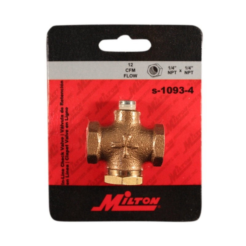1/4″ FNPT in line check valve is designed for piped systems to prevent bleed-back of pressure/material into air supply system. 1/4″ FNPT on both ends. Has a maximum pressure of 250 PSI and 12 SCFM. Valves have a 1/8″ plugged tap for a pressure gage or pressure switch. Overall length of 1 3/4″.