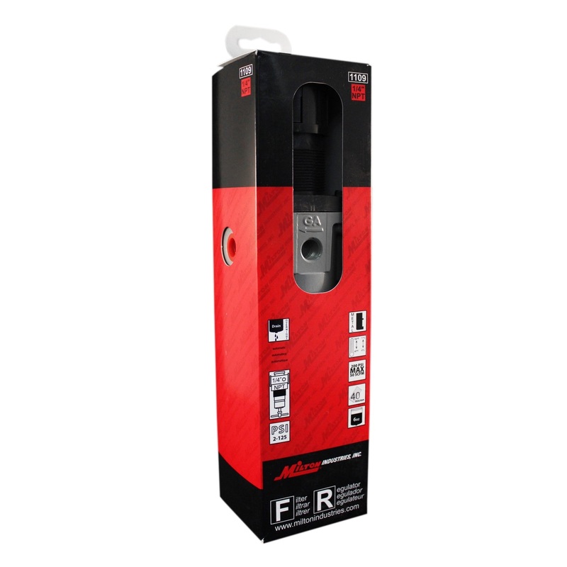 1/4″ NPT piggyback duo has the features of the standard regulator, plus the space saving convenience of a combined filter. This piggyback filter regulator comes with a 6 ounce metal bowl and a 40 micron filter. With an automatic overnight drain and relieving regulator, this duo offers a non-rising adjustment and a 3 position knob to lock, adjust or remove. Has a maximum pressure of 200 PSI and 50 SCFM.