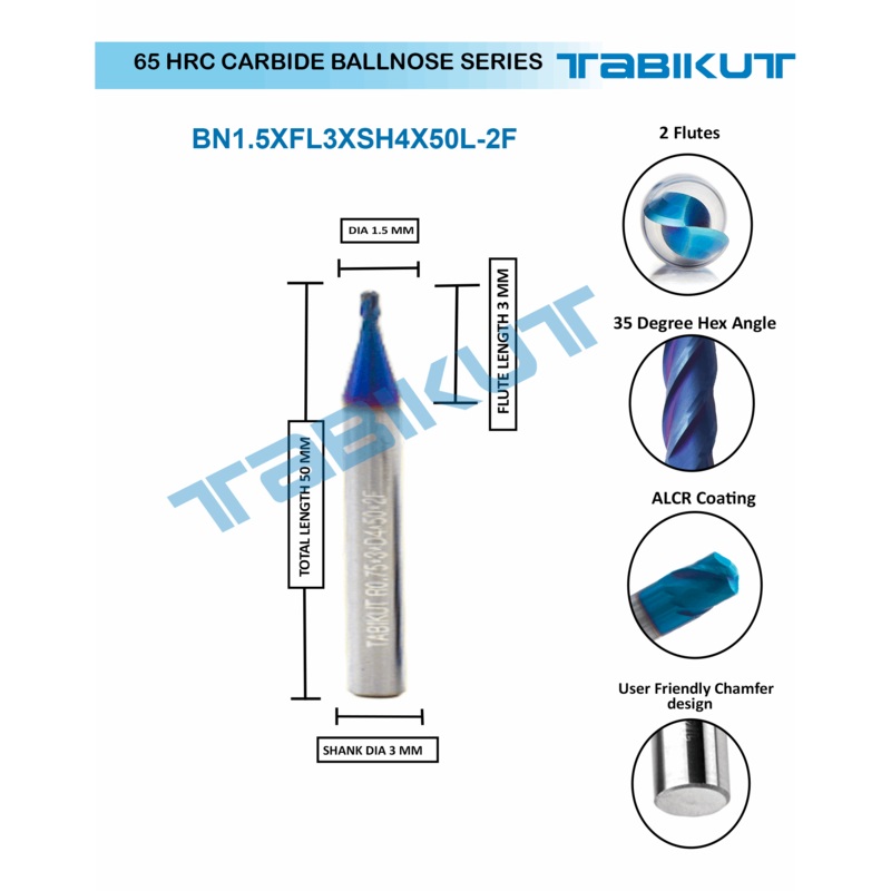 1.5 mm Carbide ballnose 65 HRC 2 Flutes PACK OF 1