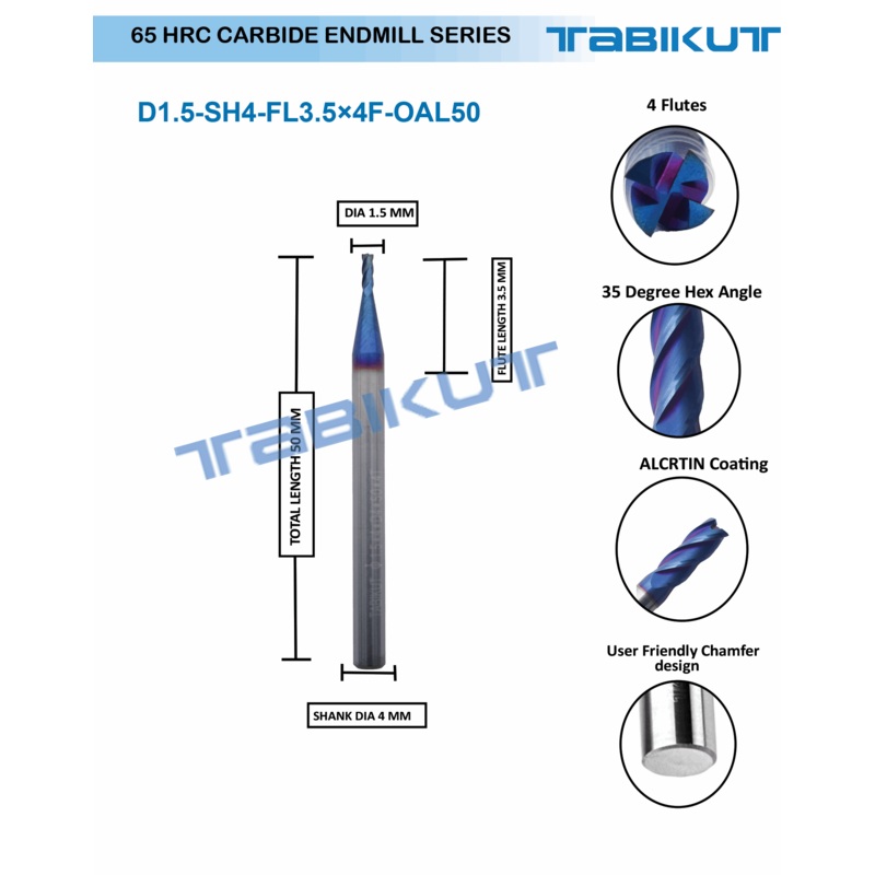 1.5 mm Carbide Endmill 65 HRC 4 Flutes PACK OF 1