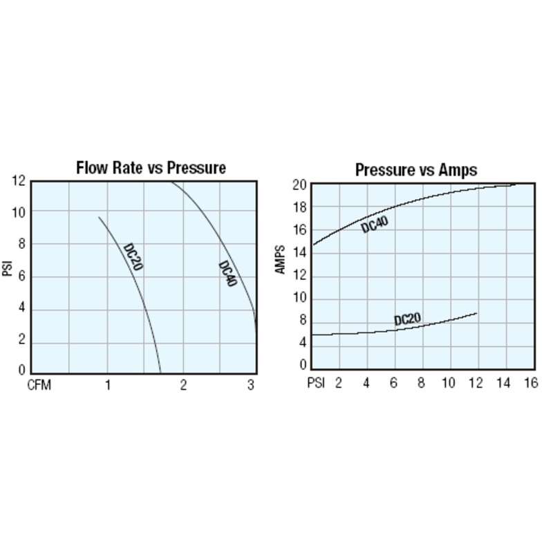 DC20 will run for over six hours on a typical car battery. Includes 9″ pigtail wires, two feet of 3/8″ I.D. outlet hose and inlet filters. Additional housing is recommended for outdoor use. Six-month warranty.