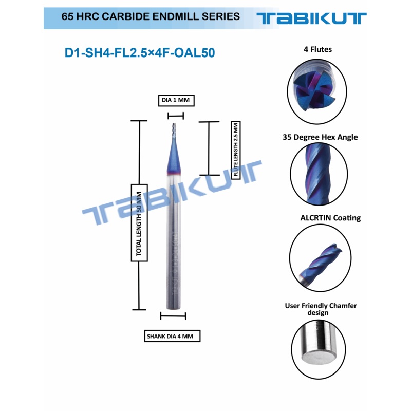 65HRC carbide endmills are made with a high-quality raw material of 0.005 microns of grain size.