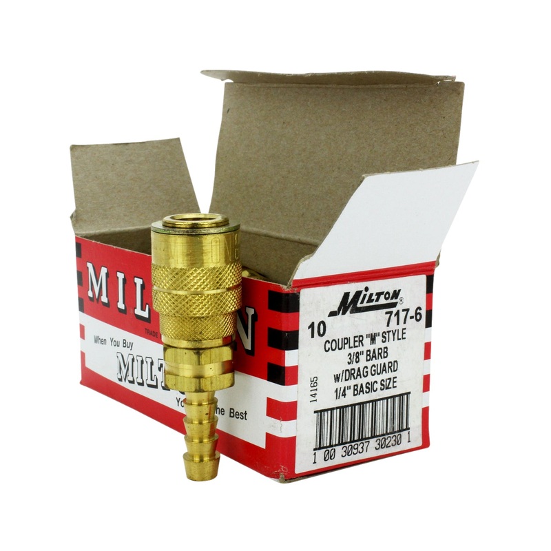The 3/8″ Hose Barb M-STYLE Coupler by Milton Industries Inc. (Part #: 717-6) is designed for durability and performance in various applications. Featuring a 3/8″ hose barb connection, these couplers are perfect for hose repair or creating custom hose lengths to suit your specific needs.