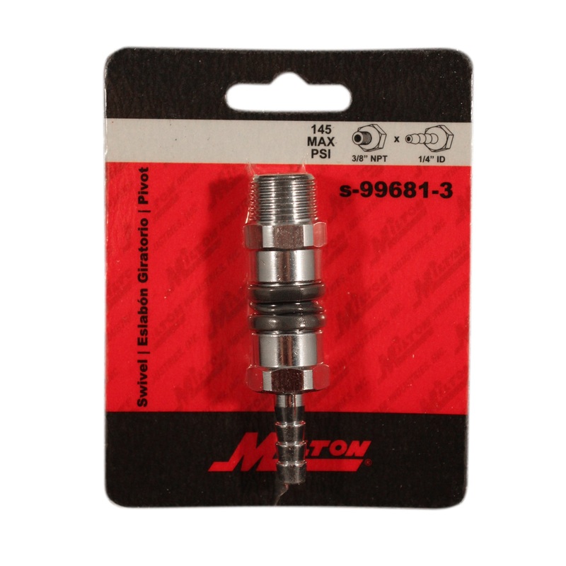 3/8″ MNPT X 1/4″ hose barb swivel fittings offer variable angle swivels that rotate 360 degrees at a 45 degree angle in any direction, virtually eliminating hose twisting and kinking. Rubber dust cover keeps dirt and moisture out.