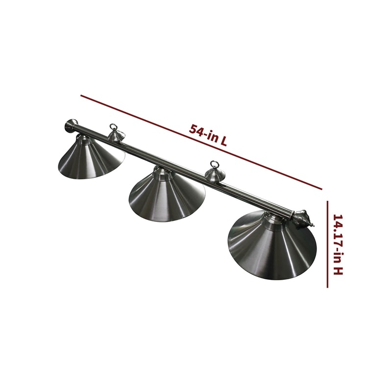 This stylish billiard light will hang beautifully above any pool table and is easy to install. Featuring a sleek metal bar and shades finished in a beautiful soft-brushed stainless steel, this light is guaranteed to add the final touch to your dream game room. Fits over any size billiard table. 180-day limited warranty.
