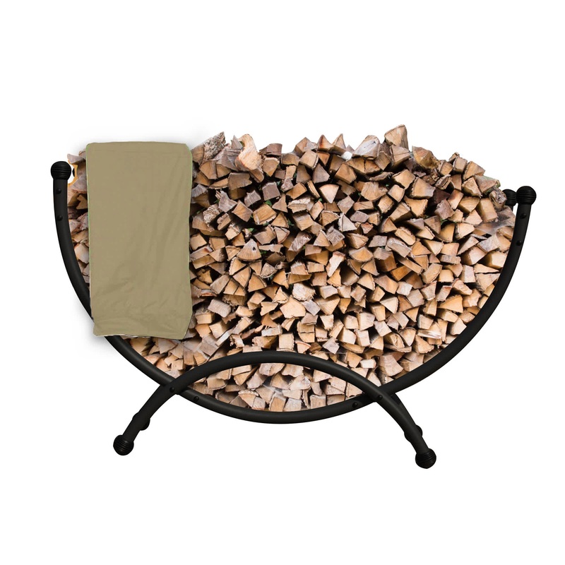 This deluxe firewood storage rack combines superior strength with a contemporary style. Made of 1.5-in steel rods covered in weather-resistant black powder, this storage rack reaches 5-ft tall and holds up to 1,100 pounds of wood. Store your firewood in an organized manner with this functional storage rack. This stylish storage unit includes a Champagne colored cover that repels moisture, perfect for protecting chopped wood from rain or dew. Dimensions: 59-in W. x 16-in D x 36-in H. Includes a 90-day limited warranty.