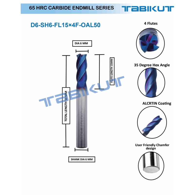 65HRC carbide endmills are made with a high-quality raw material of 0.005 microns of grain size.