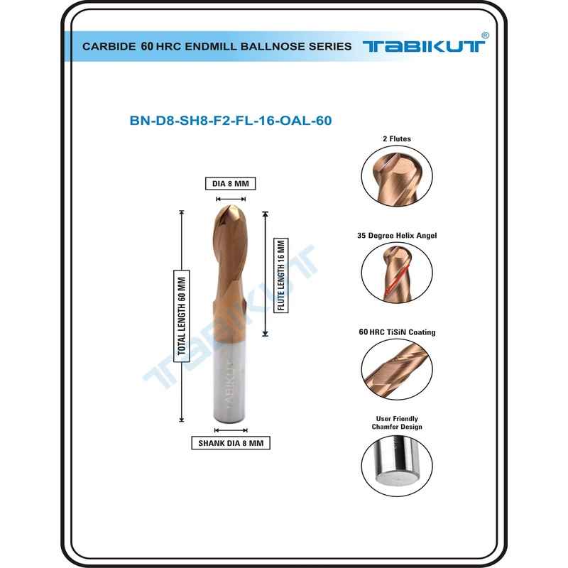 8 mm Carbide Ballnose 60 HRC PACK OF 1