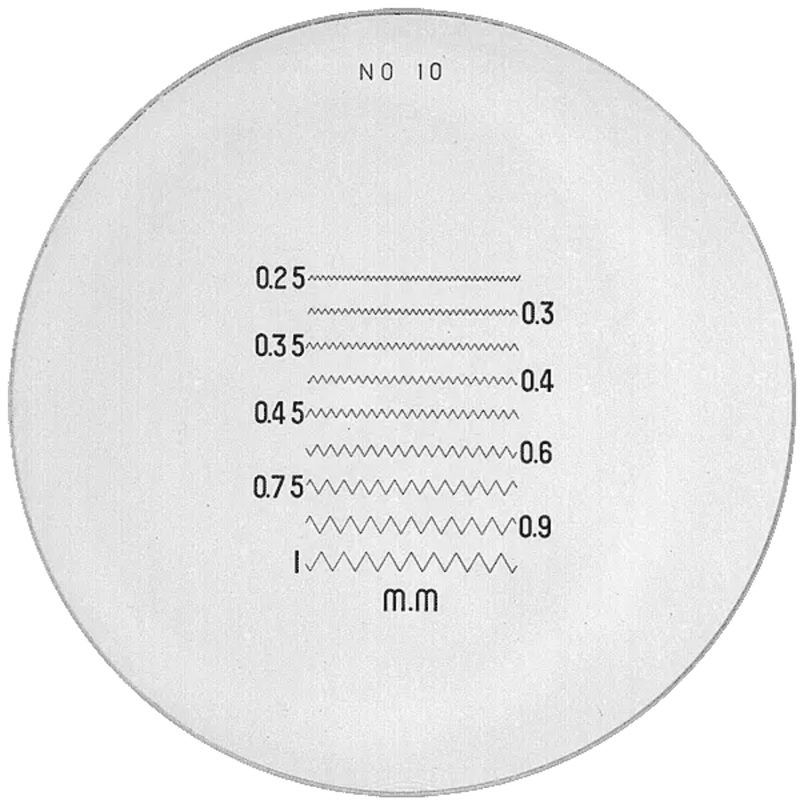 - Reticles (protected in a plastic case) are easily interchanged by a screw-in mount. Measures radii, diameters, angles, hole sizes, pitch and thicknesses.
