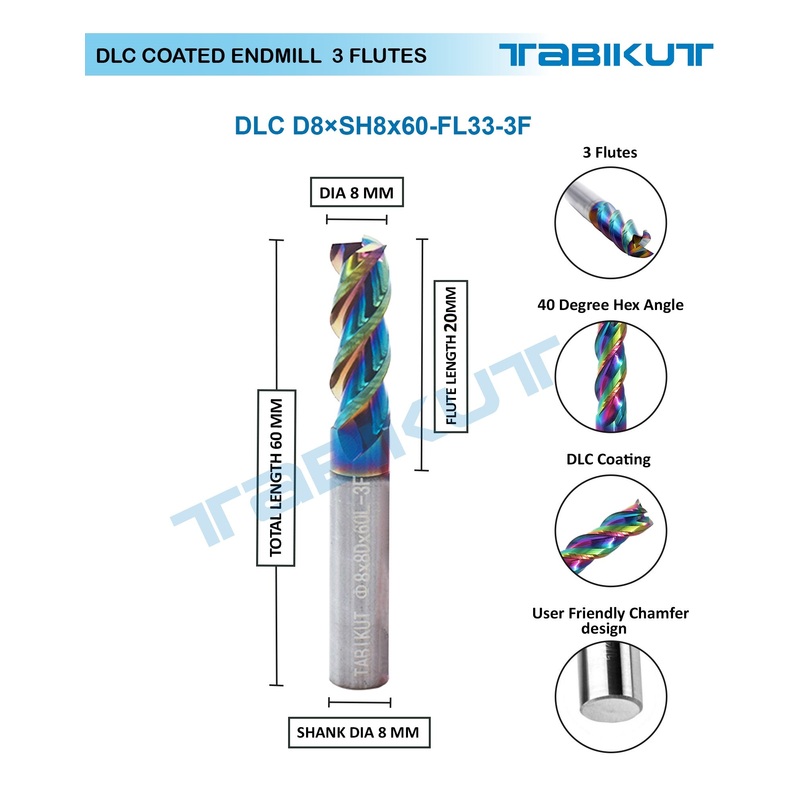 8mm 3 flute endmill 60/100 mm long DLC coated pack of 1