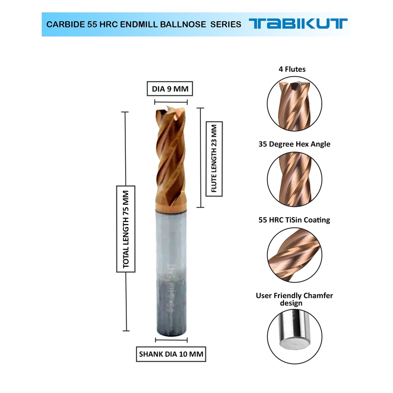 9 mm Carbide Endmill 55 HRC 4 Flutes Total Length 75mm pack of 1