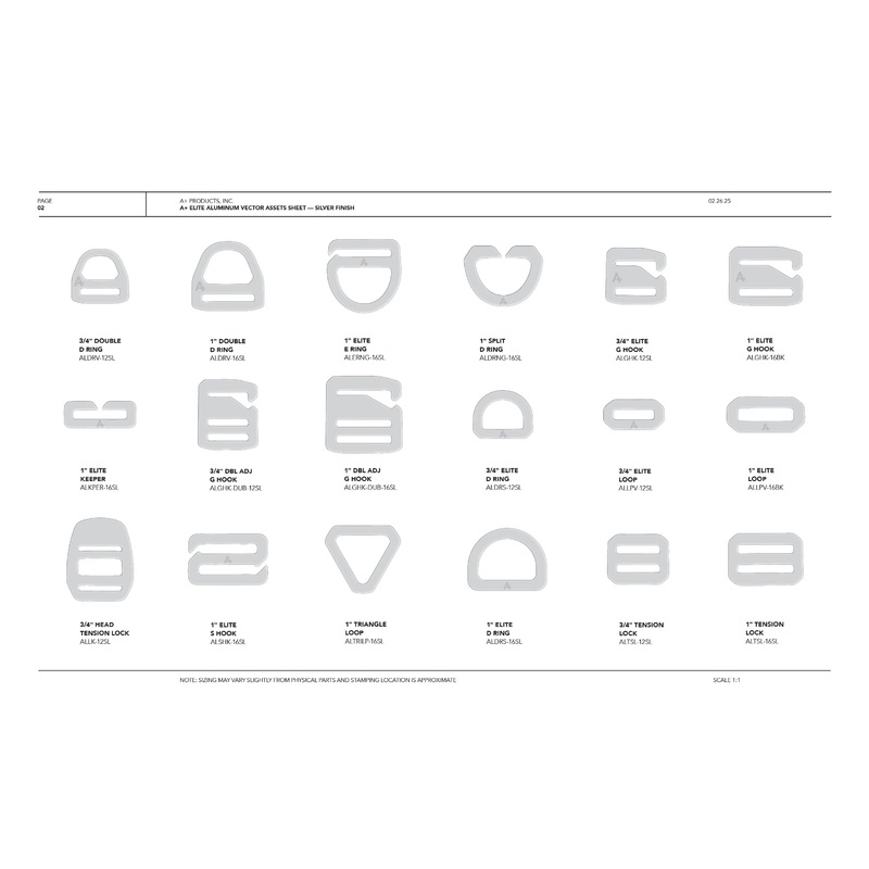 Our A+ Elite Sample Kits are designed to make sampling hardware easy. The Elite Aluminum Kits contain a sample of each item from our Elite aluminum hardware line. This Adobe Illustrator file provides detailed, customizable buckle designs with precise scaling and organized layers for seamless integration into any project. Streamline your workflow with professional-grade aluminum assets.