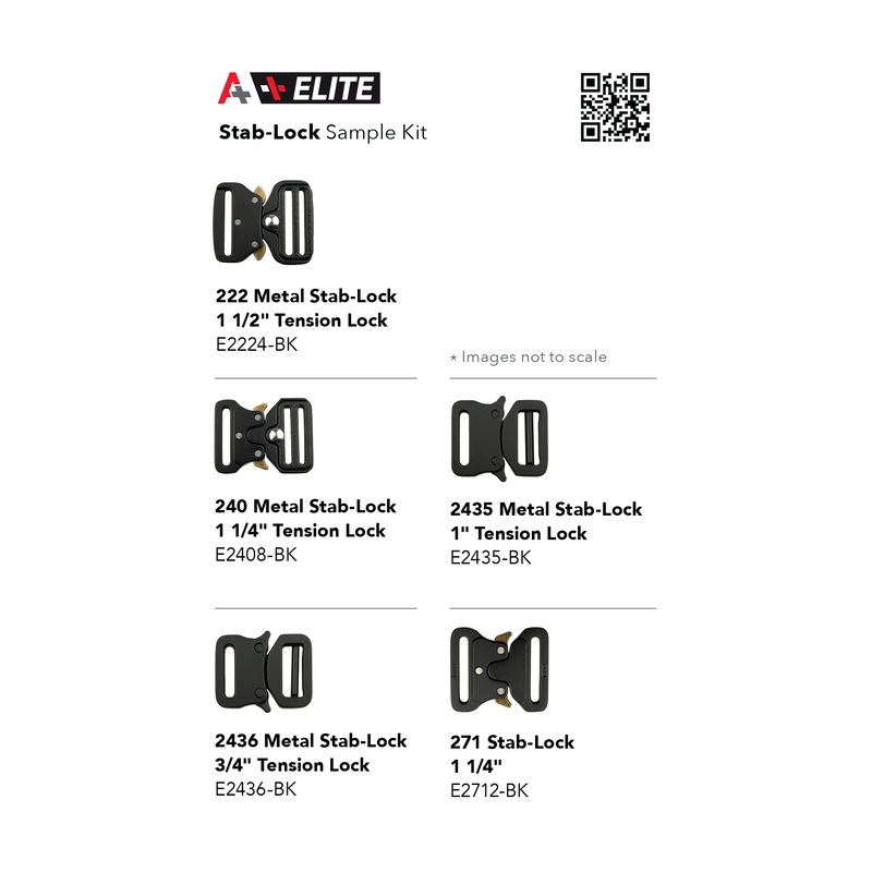 Our A+ Elite Sample Kits are designed to make sampling hardware easy. The Elite Stab-Lock Kits contain a sample of each item from our Elite Stab-Lock Line. Stab-Locks are gaining popularity as the fastener of choice for tactical styled belts, bags and apparel. The five Stab-locks range in size from 3/4″ to 1 1/2″.