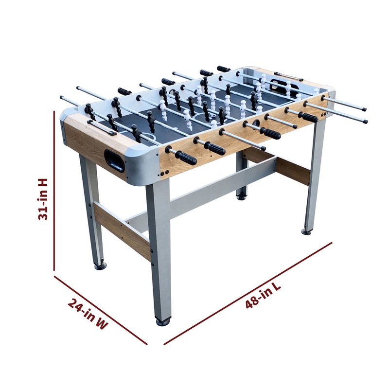 Bring classic foosball into your game room or basement with this stylish, modern foosball table. Crafted from engineered wood covered in a stylish light wood melamine and featuring a matte black playing surface, the Amherst Foosball Table will elevate any space. Goal boxes with built-in automatic ball return keep the action moving at a crisp, competitive pace. Abacus-style, slide scorers keep track of whos winning. A sturdy leg support system provides rock solid stability during intense matches. This dynamic table is the perfect gathering spot for all-around competitive family fun! Includes two 31-mm ABS foosballs. 180-day limited warranty.