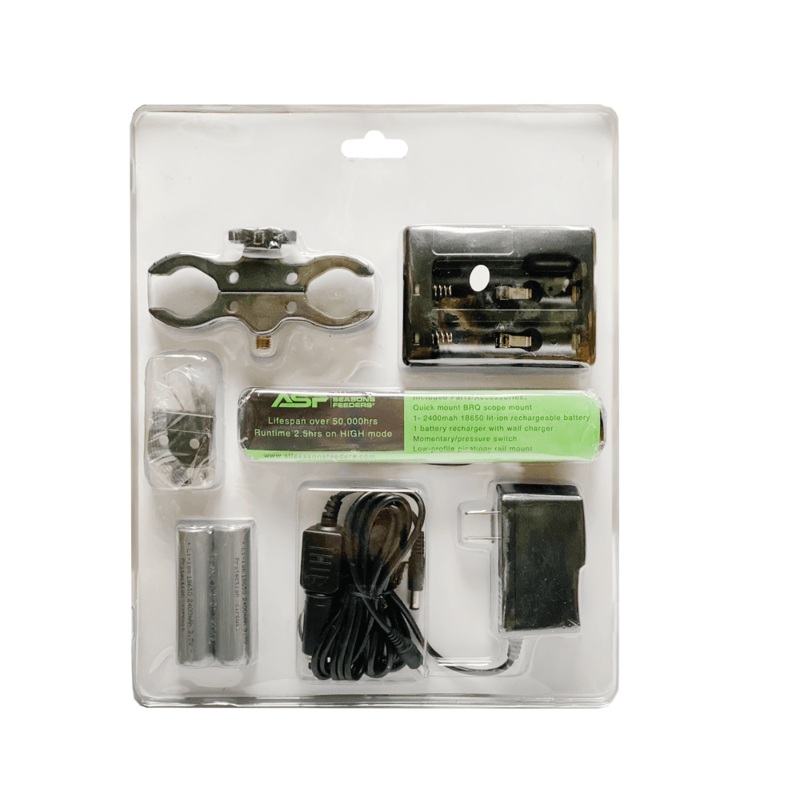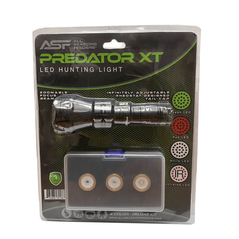 Illuminate your hunt with the ASF Predator XT Light kit! This LED predator hunting light reaches up to 500 yards away. This 4-color deluxe kit includes White, Red, Green, and Infrared LED modules. With a lifespan of over 50,000 hours, an adjustable beam, waterproof housing, and 2 rechargeable 18650 lit-ion batteries, this bad boy is the perfect tool for anyone who enjoys predator hunting!