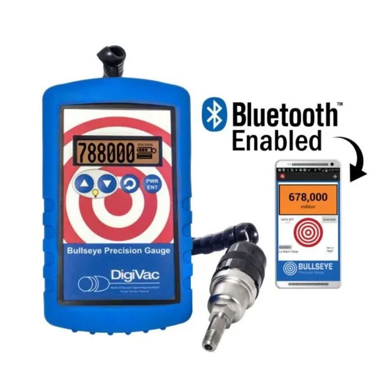 The DigiVac Bullseye Precision Gauge with Bluetooth is theworlds first Bluetooth vacuum gauge featuring one-of-a-kind patented vacuum graphing andDigiVacs Vacuum Gauge app