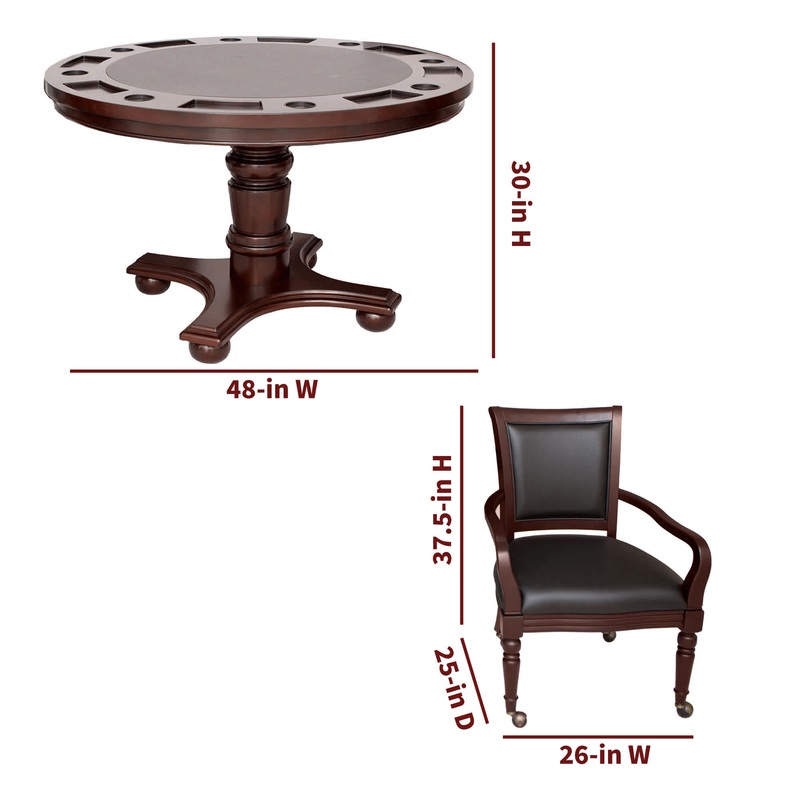 Easily switch from dining to gaming with the Bridgeport Poker Table. Perfect for dinner parties or game night, this dual-purpose set includes a 48-in game table, removable tabletop, and four matching chairs. The faux-leather poker surface has space for 8 players and each spot has a built-in drink holders and chip slot.