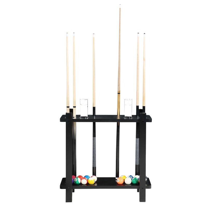 Keep your billiard playing accessories organized and close to the table. The Classic Floor free-standing Billiard Cue Rack features convenient built-in drink holders. Excellent storage for up to ten cues, chalk, table brush, and a full set of billiard balls. A perfect solution for all your billiard storage needs! 180-day limited warranty.