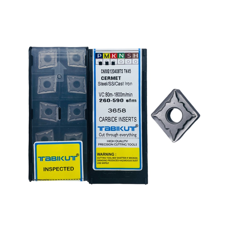 TABIKUT TK45 Cermet grade for turning alloy steels & stainless steels with high surface quality and long durable tool life due to high edge wear resistance and low coefficient of friction with economic price.