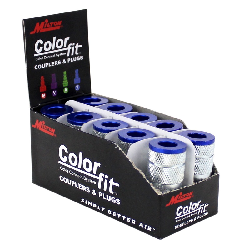 COLORFIT T-style couplers and plugs are compatible with traditional Milton T-style couplers and plugs, competitor T-style couplers and plugs, and competitor blue couplers and plugs.