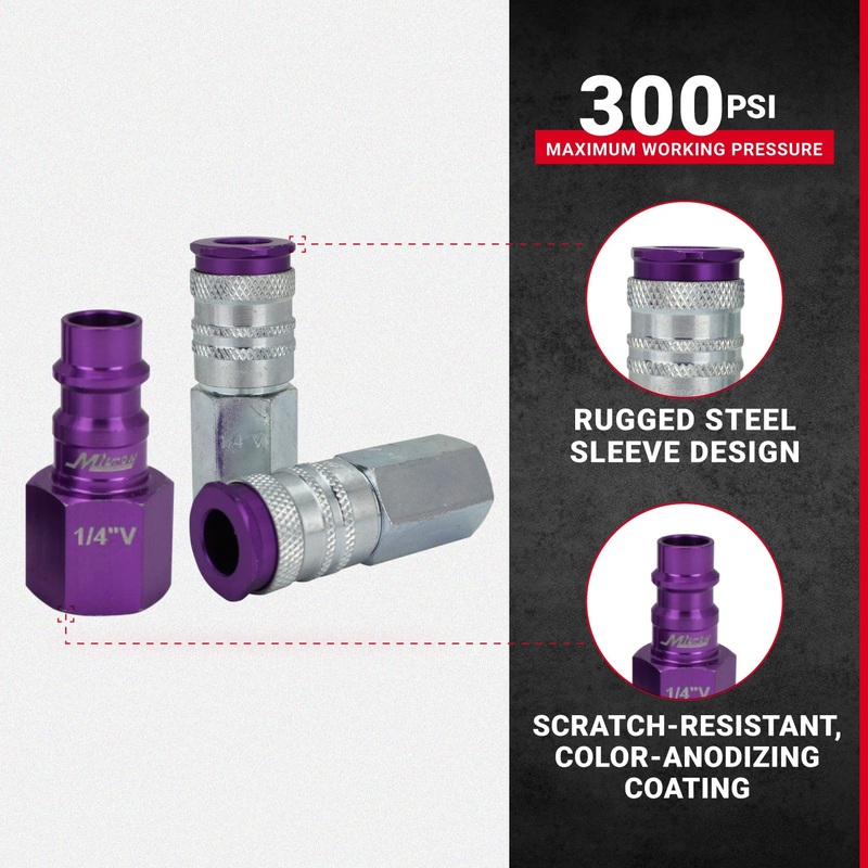Great way to solve that annoying problem of potential cross-contamination between different air lines. By dedicating certain colors to different air lines, this will eliminate the risk of mixing a lubricated line with a dry air line which will prolong your applications and help to quickly finish any project. Each piece coated with Anodized Purple aluminum and heavy duty steel sleeves to prevent scratches or dulling of the coupler and plug after use. Compare to Legacy Flexzilla A53458FZ.