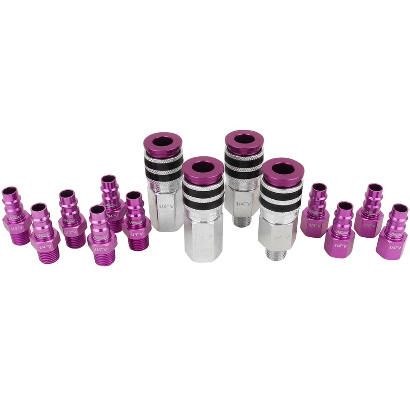 Stop starving your tools of the air they need to perform. More torque and greater speed are just a couple of the benefits possible with COLORFIT by Milton 14-Piece V-Style HIGHFLOWPRO Coupler & Plug Set. This set now offers a customized color-coded system that allows for easy matching of couplers and plugs, among the range of standard Industrial pneumatic air coupler quick connects.