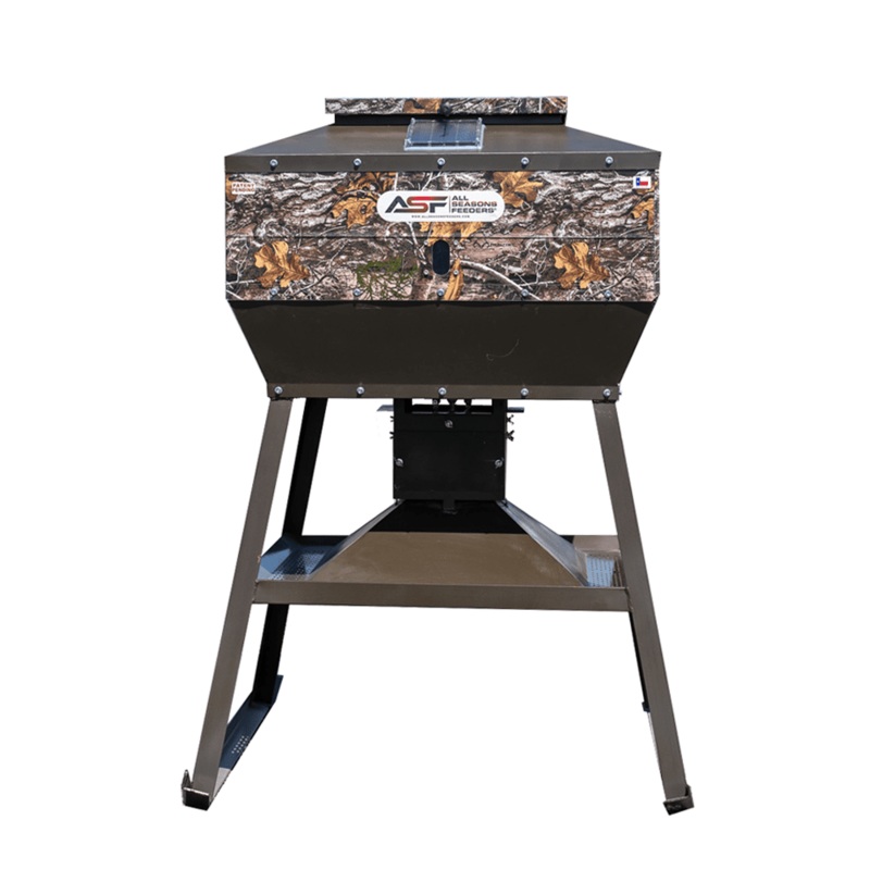 The all-new Corn Pro in Realtree camouflage by ASF comes with a patent-pending dual-purpose dispersant housing that allows you to time feed in two ways. Using the Eliminator spinner and THE-TIMER, this camo deer feeder disperses either corn or protein at the programmed times. By opening or closing a baffle system on the control unit, the feeder can be set up to either broadcast corn or trough feed protein.