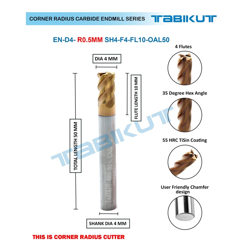 Corner Radius Endmill 4 mm in 0.5 and 1 mm radius pack of 1