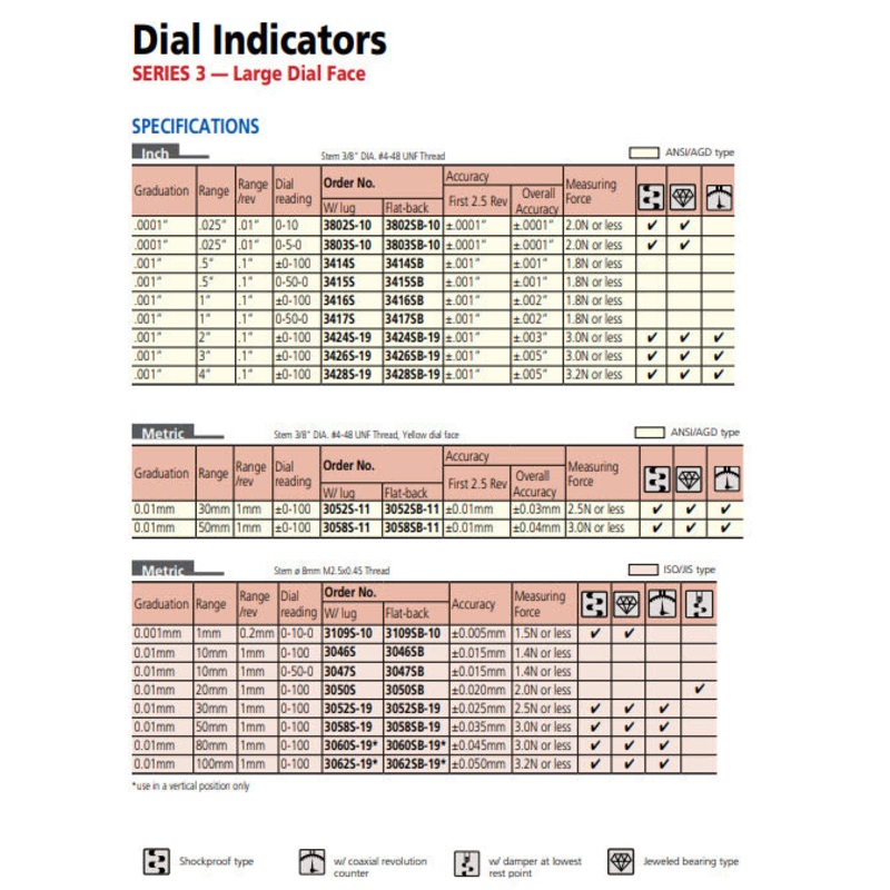 The Mitutoyo 3050S Dial Indicator with Large Dial Face has the following specifications: