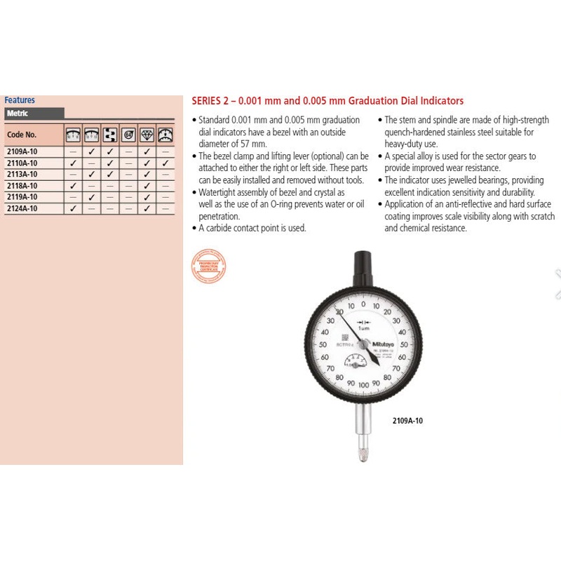 Dial Gauge, Lug Back, ISO Type IP64, Jewelled Bearing, Shockproof, 1mm, 0,001mm 2109A-70