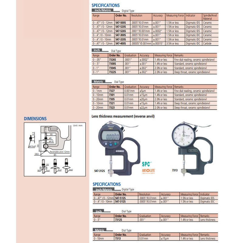 A Mitutoyo high-resolution dial-gauge-based instrument designed for quick and efficient measurement of small dimensions. Ideally suited for precise measurement of the thickness of paper, film, wire, sheet metal and similar materials. The convenient grip handle, thumb trigger and spring-loaded plunger make the instrument easy to use.