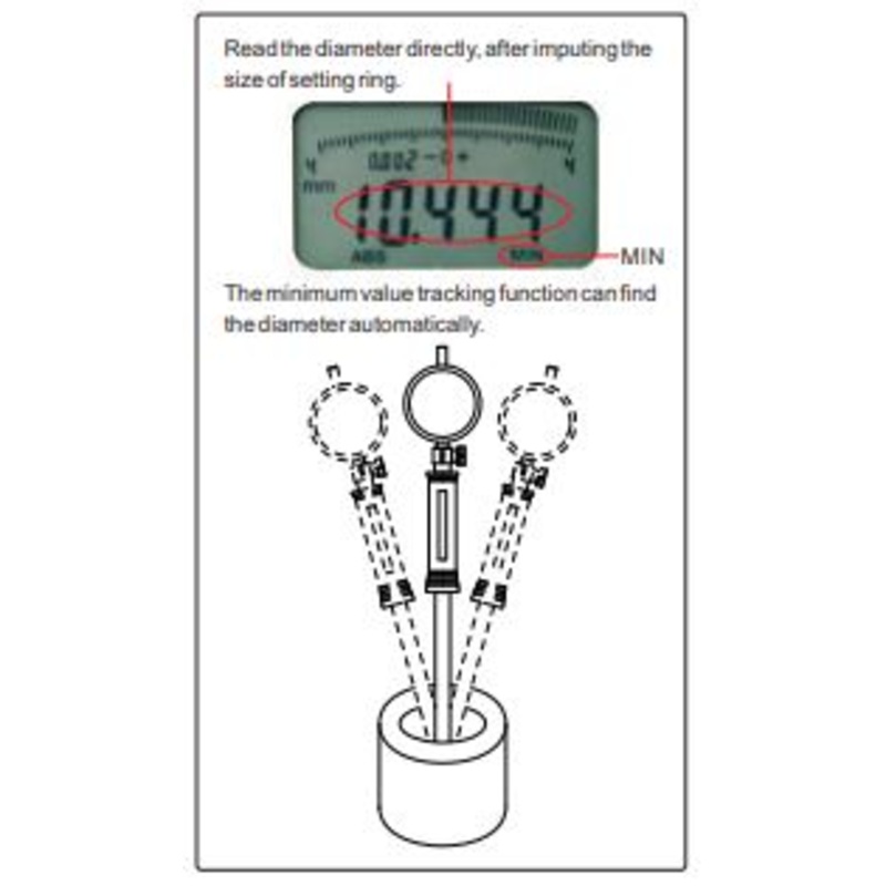 Digital Insize Bore Gauge for small holes covering the range of 6mm diameter to 18.5mm. Measuring depth is approximately 100mm. Optional accessories include setting rings for accurate and repeatable measurement the gauge also has optional SPC cable data output.