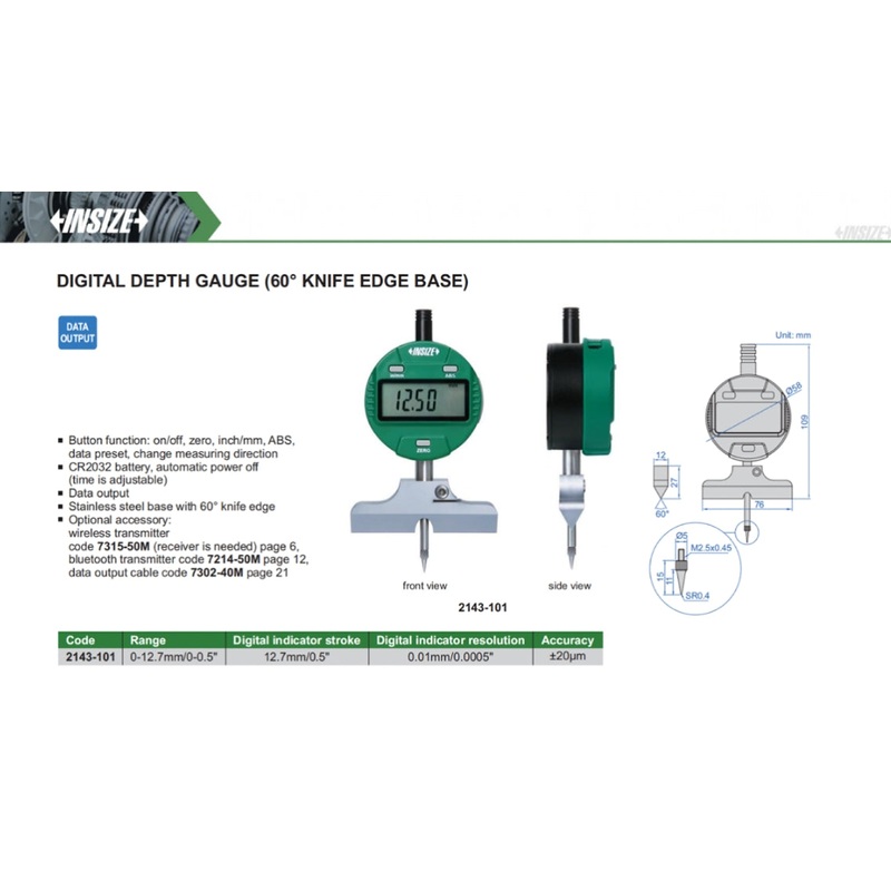 2143-101Digital Depth Gauge (60 degrees Knife Edge Base) | Insize 2143 | Range 0-12.7mm/0-0.5 | Resolution 0.01mm/ 0.0005