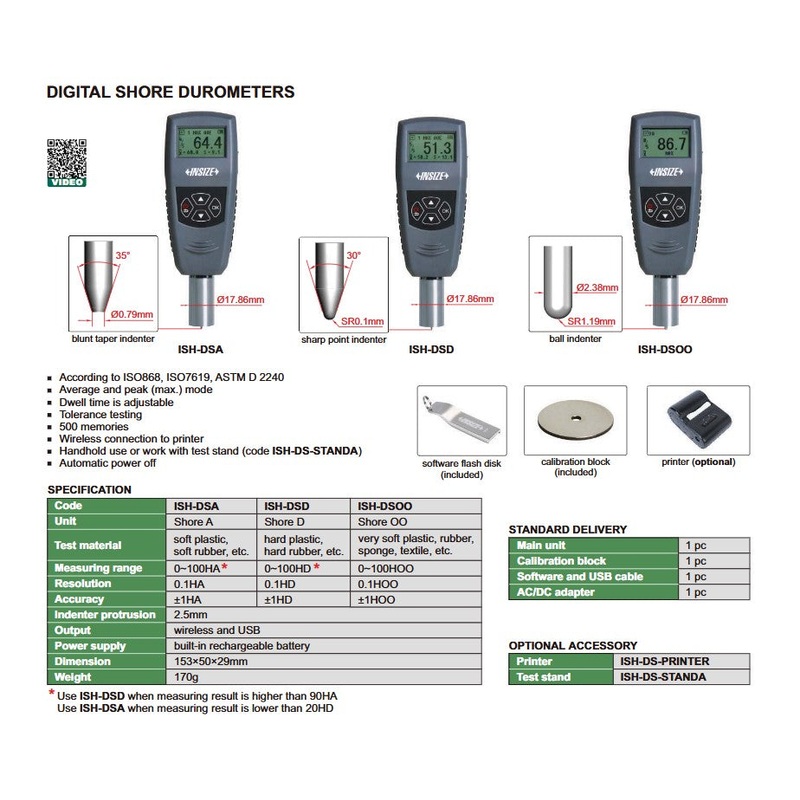 ISH-DSOO ISH-DSA-PRINTERDigital Shore Durometer | Insize ISH Series | Shore A; Shore D or Shore OO | Optional Printer & Stand