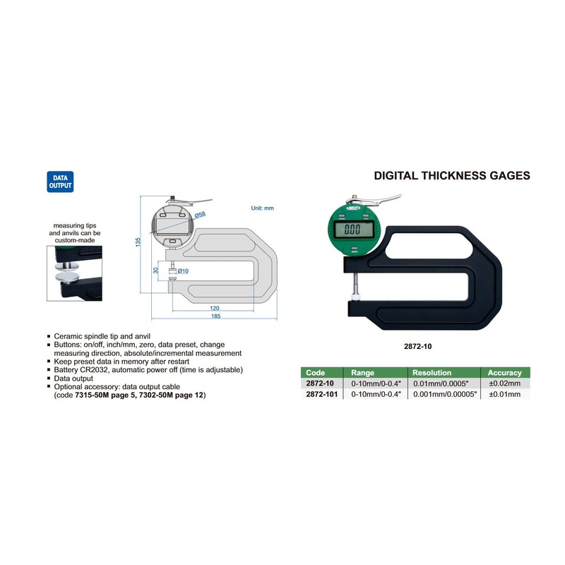 2872-101Digital Thickness Gauge | Insize 2872 Series | Range 0-10mm/0-0.4 | Resolution 0.01mm/0.0005 or 0.001mm/0.00005