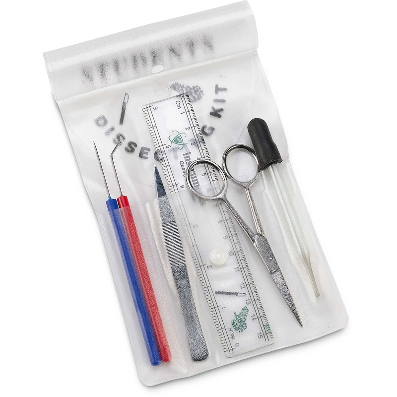 Each Kit includes: 6 inch ruler, scalpel, 4.5″ Scissors, 4.5″ Forceps Eye Dropper, 6 Dissecting Pins, and a Plastic Case.