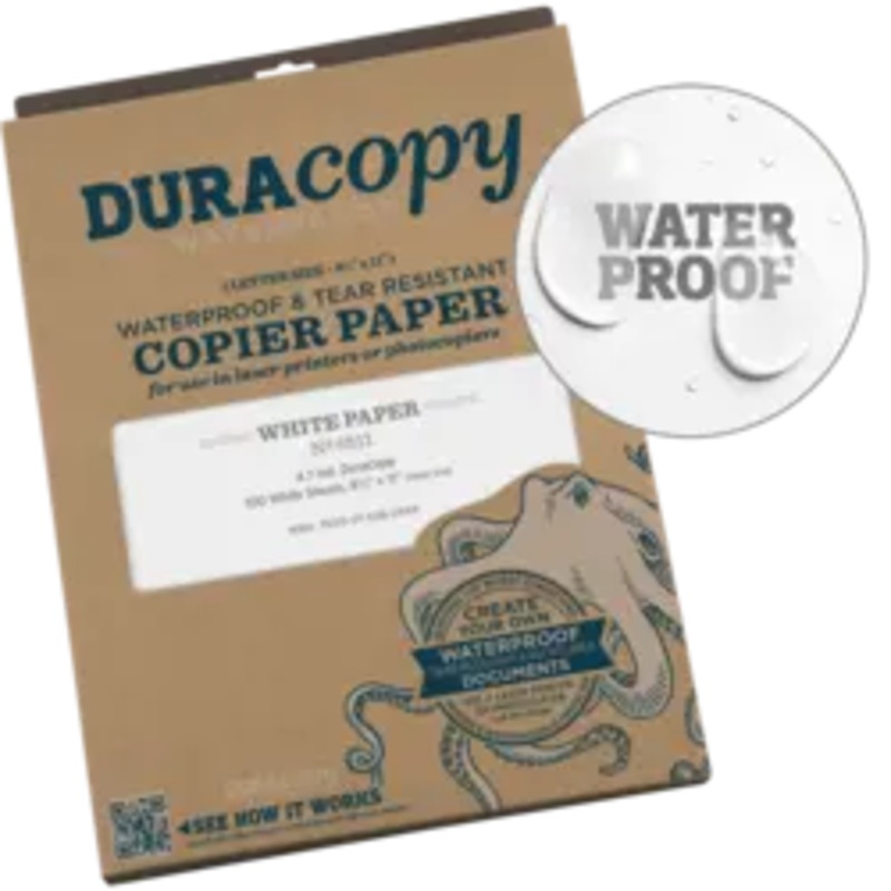 DuraCopy is a synthetic, heat resistant paper created for use in extreme conditions. It is actuallywaterproofand can even be used under water. Copy or laser print your own waterproof forms. Ideal for any extreme situation. Use in your photocopier or laser printer on both sides. Not for ink-jet printers. White only. 8.5″ x 11″, Package of 100 Sheets.