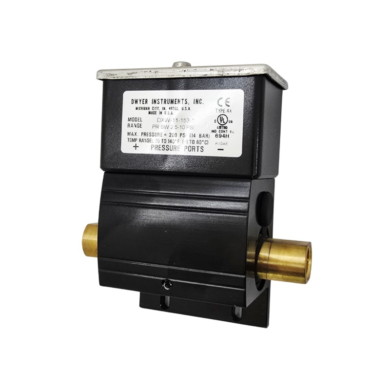 The Dwyer DX Series Wet/Wet Differential Pressure Switch provides reliable contact output based on the pressure difference between two sources. Constructed with brass and fluoroelastomer wetted parts, it is compatible with most gases and water-based solutions. Designed for precise low differential pressure detection, it offers set points from 1 psid (0.07 bar) on decreasing pressure up to 75 psid (5.17 bar) on increasing pressure. With a high static pressure rating of 200 psig (13.8 bar) and a weatherproof UL Type 4X enclosure, it is ideal for demanding outdoor or wash-down environments.