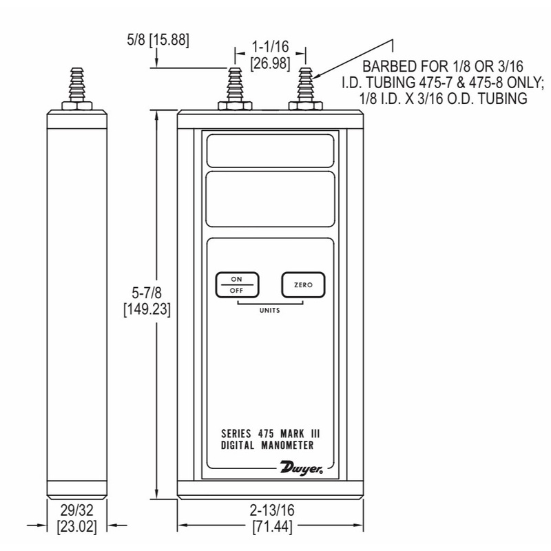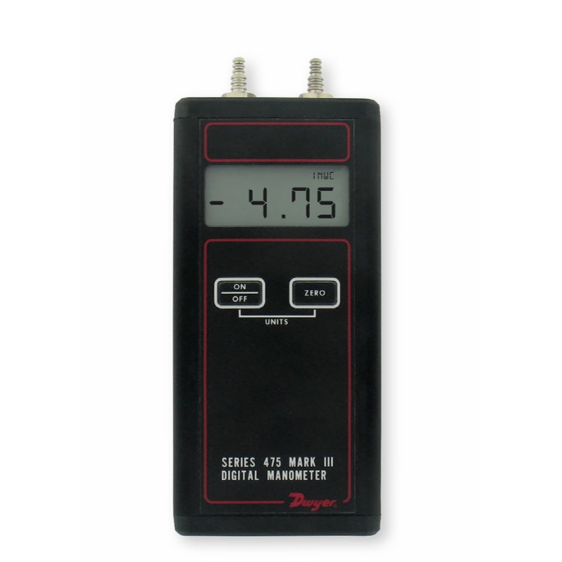 The Series 475 Handheld Digital Manometer measures positive, negative, or differential pressures of air and compatible gases in ranges from 1 in w.c. (0.249 kPa) to 150 psid (10.34 bar). The dual push pads on the front panel control the on/off, auto zero, and pressure unit selection, allowing for simple operation with no set up needed. When used with a Dwyer Pitot tube (u), the Series 475 can also be used as an air velocity gauge.
