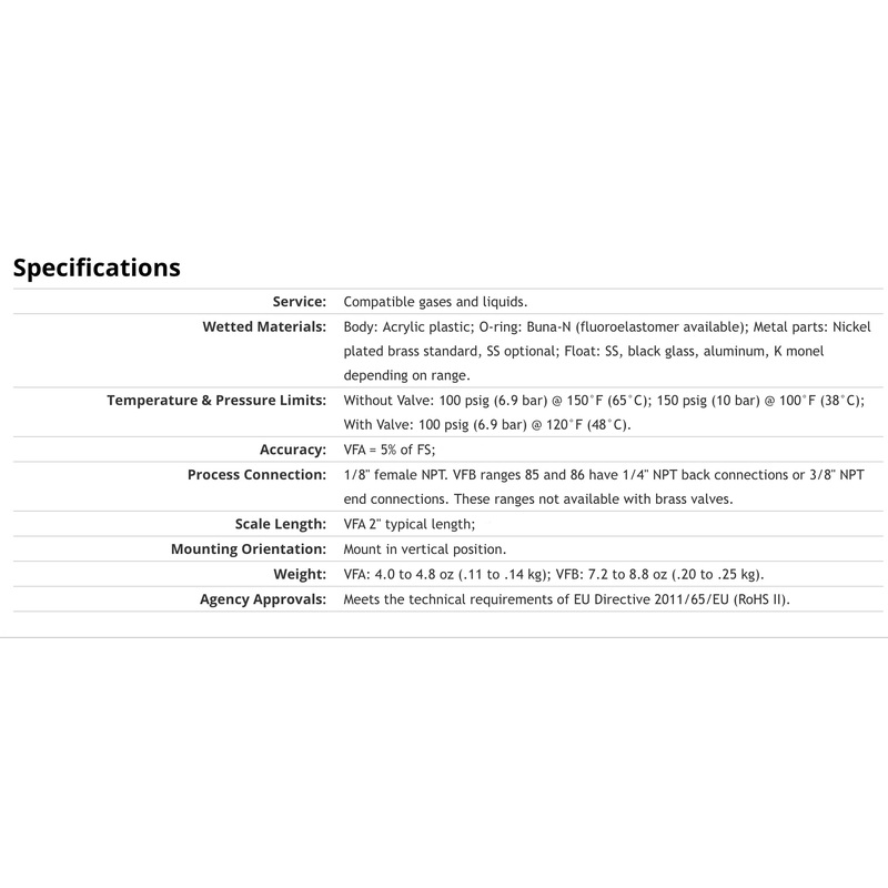 The VF Visi-Float Acrylic Flowmeters are a line of direct reading, precision machined, clear acrylic body Flowmeters suitable for both gas and liquid applications.