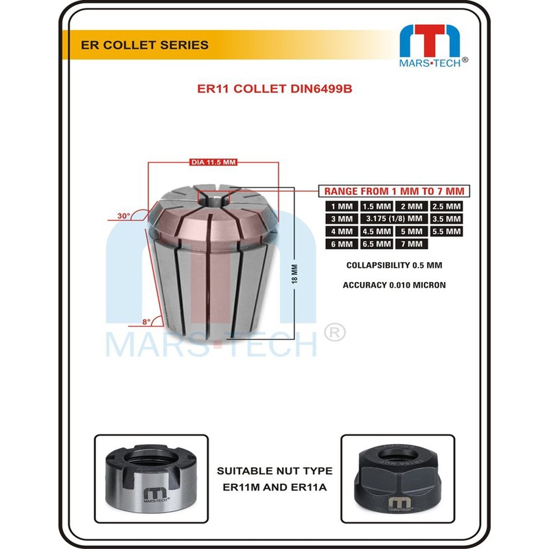 ER11 series collets have a capacity of 1mm-7mm. Each ER11 collet has a range of (0.5mm). The size indicated on the collet is the largest size it can hold and can be collapsed smaller within its collapse range of (0.5mm). For example, ER11-3mm can grab a round shank from 3mm diameter to 2.5mm diameter.