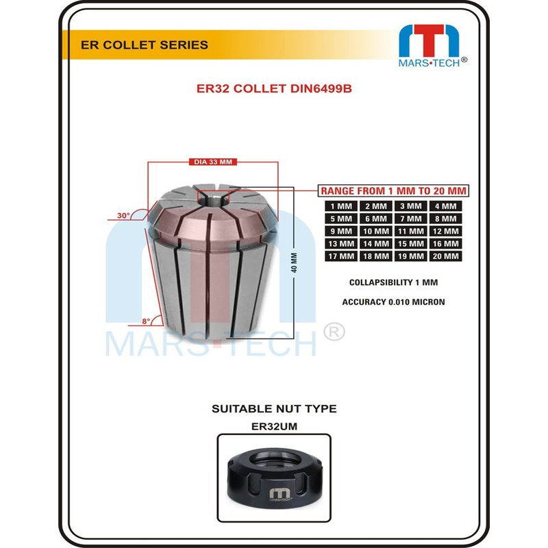 ER32 series collets have a capacity of 1mm-20mm. Each ER32 collet has a range of (1 mm). The size indicated on the collet is the largest size it can hold and can be collapsed smaller within its collapse range of (0.9mm). For example, ER32-6mm can grab a round shank from 6mm diameter to 5.1mm diameter.