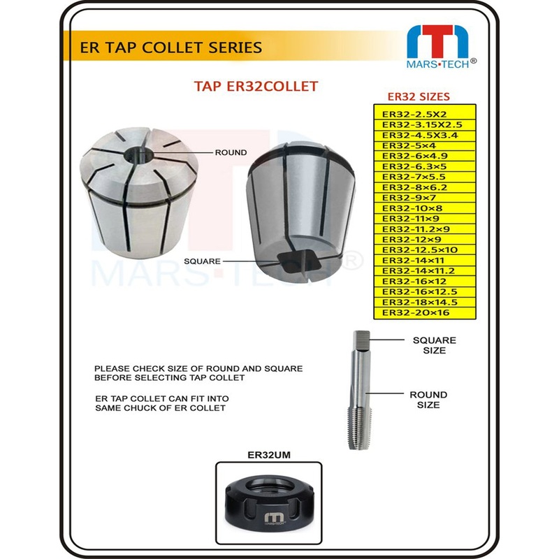 EVERY TAP HAS A SQUARE AND ROUND SO YOU JUST NEED TO CHECK SQUARE AND ROUND SIZE OF TAP AND ER CHUCK SIZE THAN YOU CHOOSE WHAT COLLET WILL FULFILL YOUR PURPOSE