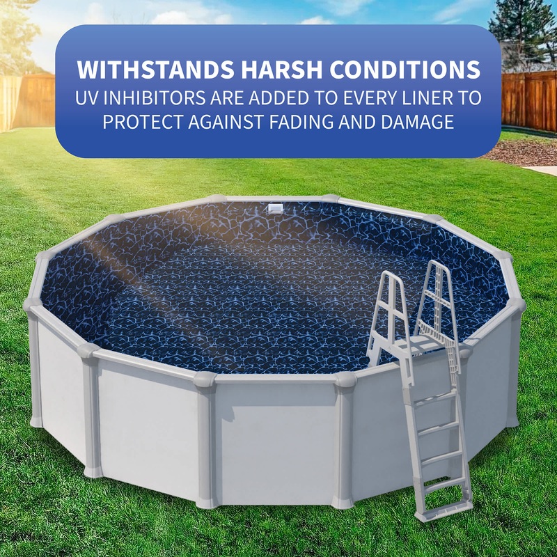 The Evening Bay Overlap Pool Liner offers a contemporary take on a classic liner pattern. Featuring deep blues highlighted by a crisp light blue, it creates the effect of shimmering water. This pattern gives a timeless and sophisticated appearance to your above-ground pool with a modern twist. Crafted from standard-gauge, premium vinyl, this liner has UV inhibitors to protect against fading and damage from sunlight and water. The welded seams ensure a smooth finish and long-lasting durability. Backed by a 15-year warranty.