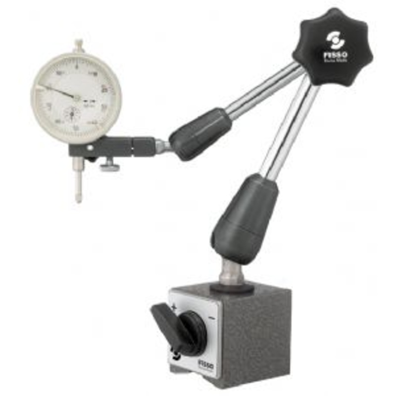 The FISSO (Swiss Made) Classic Line contains proven products with chrome-plated arm sections. Equipped with a zero-play microfine adjustment (F) with a combined holder for dial gauges and DTI’s.