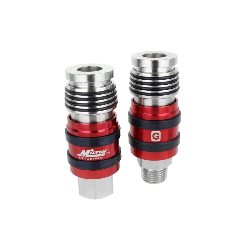 PATENTED Milton ‘s G-Style Universal Safety Exhaust couplers safely bleed excess air pressure and disengage fittings without dangerous blow-back from trapped pressure inside your air line or hose. This 1/2″ NPT industrial air coupler can be used to safely disconnect your air tools from the hose eliminating the threat of potentially dangerous hose whip. Instead, the air hose coupler remains connected to the plug while pressurized air is safely bled off. The universal design provides air compressor fittings compatible with two interchanges: G-Style .125 and .375. This sturdy coupler fitting is made of heavy-duty steel, making it the ideal air compressor accessory for any air hose or pneumatic tool that requires a long-lasting pneumatic coupler.
