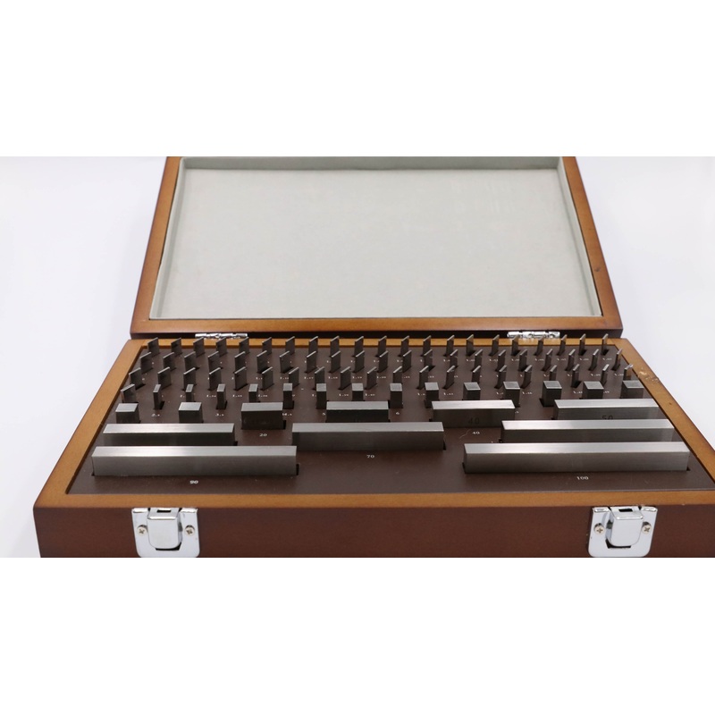 87 piece set of quality hardened steel gauge blocks each with unique serial number housed in a tailor made box with clear size markings.