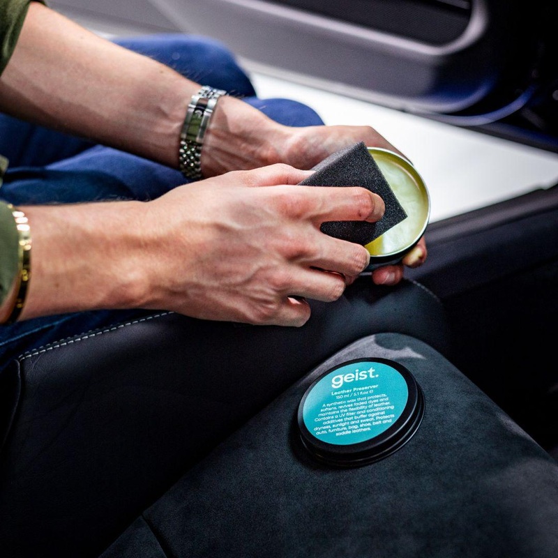 Geist. Leather Preserver is a synthetic wax that protects, softens, revives faded dyes and maintains the flexibility of leather. It contains a UV filter and additives that buffer against sunlight, sweat and dryness. It prevents the formation of radicals. Radicals are molecules that break down leather which is a natural polymer and cause yellowing, cracking and loss of elasticity. It offers strong water-repellence and keeps old leather soft & flexible.