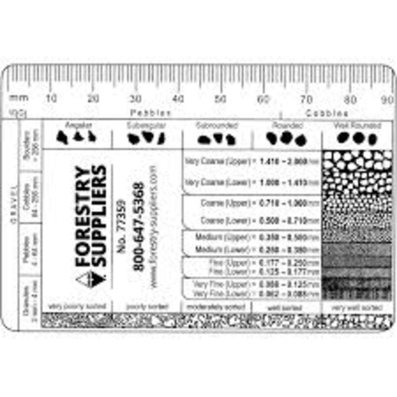 This durable grain size chart is made from transparent plastic offering the ability to do an accurate comparison and sizing of grains. Also references gravel.
